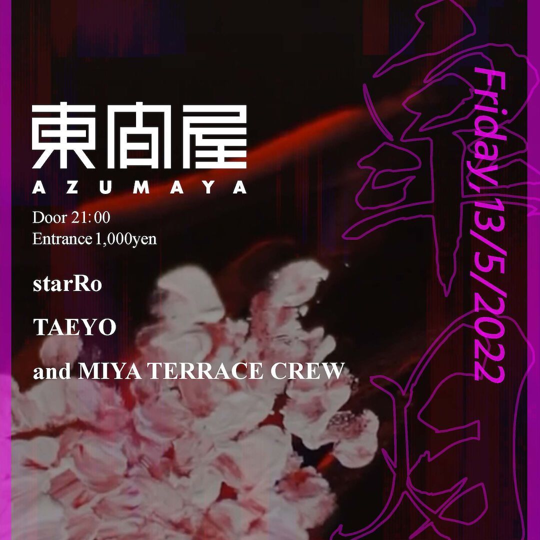 2022.05 13 MAY Azumaya -Friday- CROSSOVER 0 Shares Facebook Twitter google Line DATE: 2022-05-13 FRI OPEN: 21:00 VENUE: PRICE: Music Charge ¥1,000 LINE UP: starRo TAEYO and MIYA TERRACE CREW