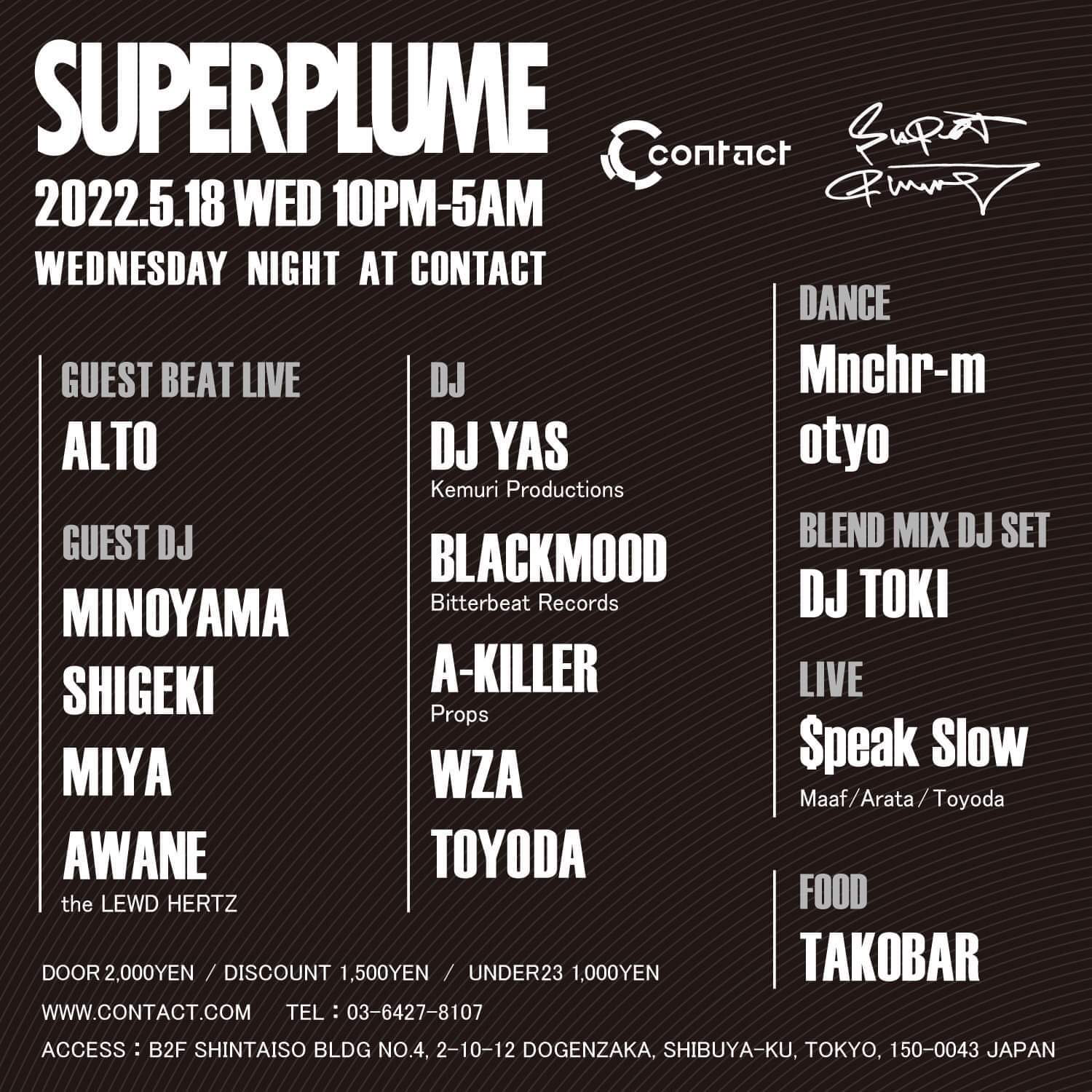 豪華ゲストとSuper Plumeクルーが2フロアに渡って絡み合うスペシャル回が開催だ。Contact最長のレギュラーヒップホップパーティSuper Plumeも残すところ2回、ヒップホップ/ビート・ファンはもちろん、ダブやソウル、ハウス・リスナーをも満足させるクロスオーバーな空間を描いていた。