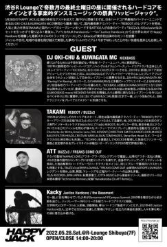 5月28日の「HAPPY JACK」は3組の多彩なゲストを迎えて、賑やかに開催!まずは、日本ハードコア界最強のパーティーユニットであるDJ OKI-CHU & KUWAGATA MCが静岡から襲来!続いて、国内最長寿テクノパーティー「REBOOT」のレジデントを努め、人気と実力を誇るTAKAMIと国内ハードグルーヴシーンをリードするATTの2人が自身のパーティ「BUZZ×3」のExclusiveなDJセットを引っさげて殴り込み!最後に、アメリカのUK Hardcoreレーベル「Justice Hardcore」から全世界に向けてHappy Hardcoreを踏襲した最新スタイルのトラックをリリースしているKackyが東京初出演のDJセットを披露!