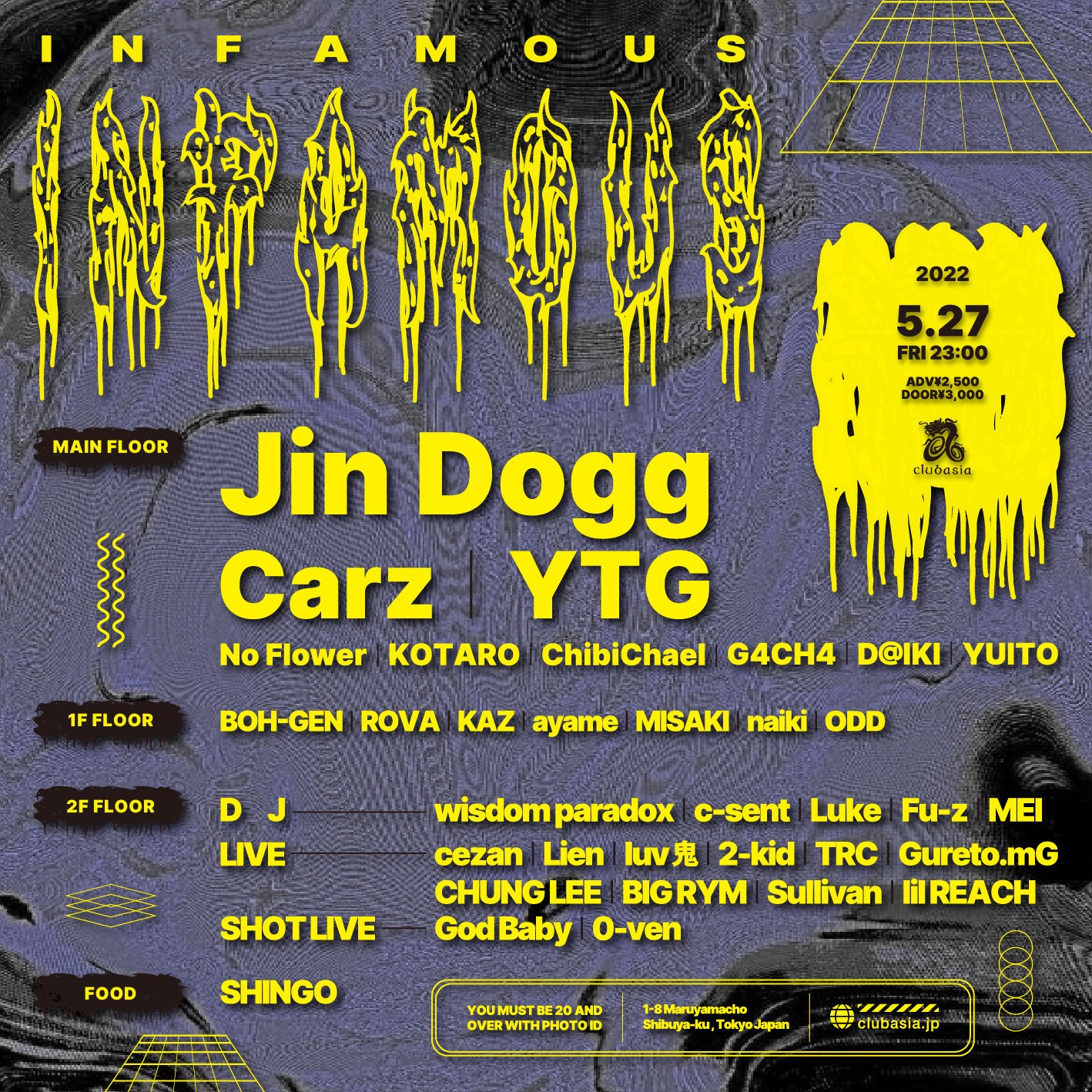 2022.05 27 MAY INFAMOUS HIPHOP TRAP ALLMIX 0 Shares Facebook Twitter google Line DATE: 2022-05-27 FRI OPEN: 23:00 VENUE: PRICE: adv¥2,500 / door¥3,000 LINE UP: Jin Dogg