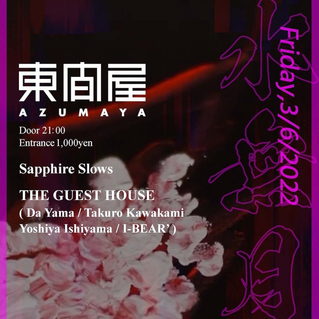 2022.06 03 JUN Azumaya -Friday- HOUSE TECHNO 0 Shares Facebook Twitter google Line DATE: 2022-06-03 FRI OPEN: 21:00 VENUE: PRICE: Music Charge ¥1,000 LINE UP: Sapphire Slows THE GUEST HOUSE (Da Yama / Takuro Kawakami / Yoshiya Ishiyama / I-BEAR’)