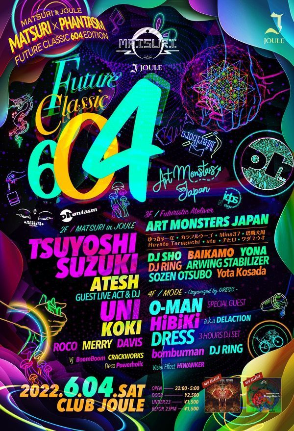 MATSURI DIGITAL より、MATSURI PRODUCTIONS の創設者であり、PRANA 名義としても数々のスマッシュヒットを世に送り出してきた世界の Tsuyoshi Suzuki と、今年 DJ 十五周年を迎えた MATSURI DIGITAL 所属アーティスト ATESH の二名が出演し、Phantasm Records からは楽曲 The Hunter Becomes The Hunted が Beatport Chart TOP 10 に輝いた UNI による LIVE SET に加え、シーン黎明期から活躍する PHANTASM RECORDS 所属 DJ、KOKI が DJ 活動三十周年を迎えて MATSURI in JOULE に初登場する。