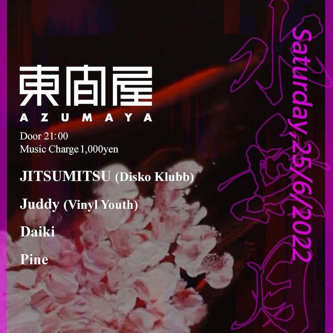 2022.06 25 JUN Azumaya -Saturday HOUSE DISCO 0 Shares Facebook Twitter google Line DATE: 2022-06-25 SAT OPEN: 21:00 VENUE: PRICE: Music Charge ¥1,000 LINE UP: JITSUMITSU (Disko Klubb) Juddy (Vinyl Youth) Daiki Pine