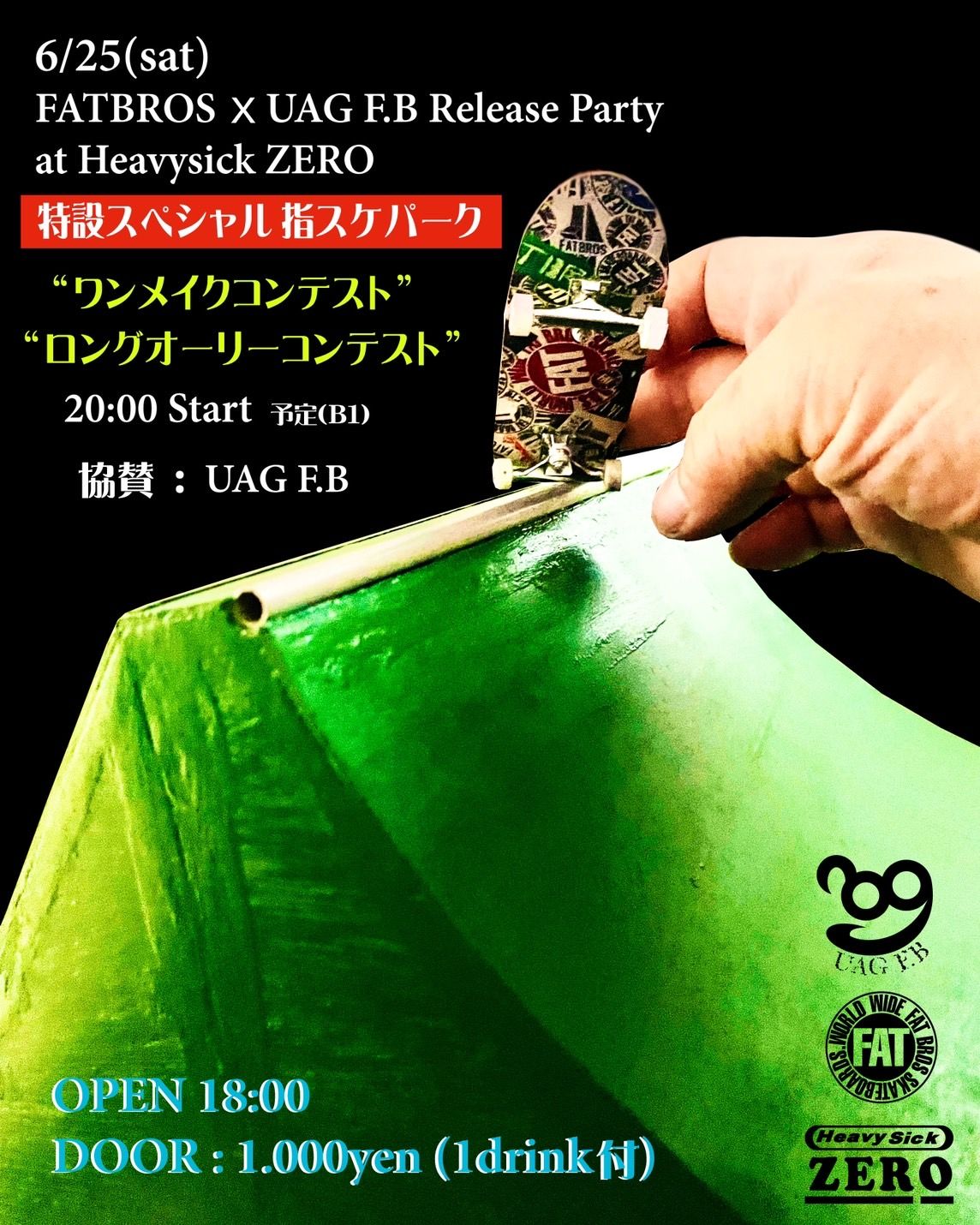 人生を楽しむ指へ。 日本の職人による指スケブランド UAG F.B からFATBROSのオリジナル指スケを発売します。また6/25(土)には中野ヘヴィーシックゼロにて、発売記念イベントを開催!この日限りのスペシャル指スケパーク、指スケのワンメイクコンテスト、ロングオーリーコンテストなどなど盛り沢山でお届けします!
