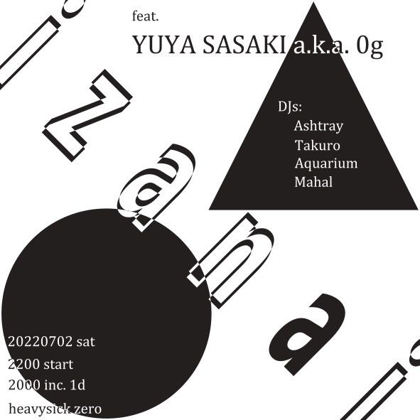 2022.07 02 JUL izanai HOUSE CROSSOVER 0 Shares Facebook Twitter google Line DATE: 2022-07-02 SAT OPEN: 22:00 VENUE: PRICE: [DOOR]2,00YEN(1D込) LINE UP: ■Guest DJ YUYA SASAKI a.k.a. 0g ■izanai DJ Ashtray Takuro Mahal Aquarium a.k.a 外神田deepspace http://www.heavysick.co.jp/zero/