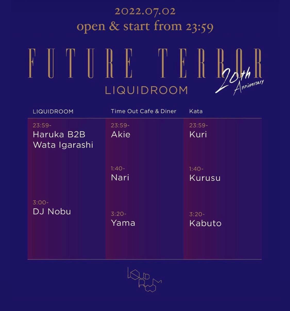 2022.07 02 JUL Future Terror 20th Anniversary PICK UP HOUSE TECHNO OTHER 0 Shares Facebook Twitter google Line DATE: 2022-07-02 SAT OPEN: 23:50 VENUE: PRICE: LINE UP: 【LIQUIDROOM】 DJ Nobu Haruka B2B Wata Igarashi 【Time Out Cafe & Diner】 Akie Nari Yama 【KATA】 Kabuto Kuri Kurusu