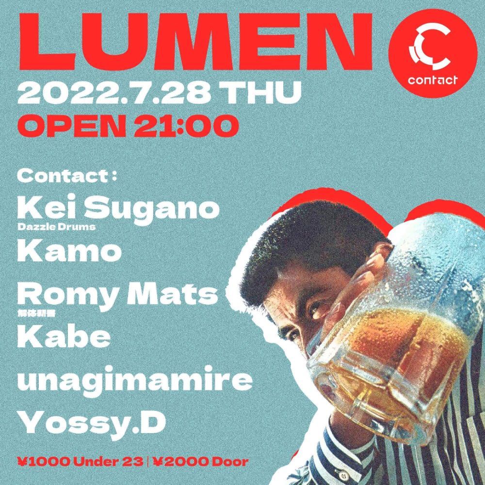 耳と腕と酒量は間違いないunagimarireと、MOMCにも参加し、人気実力自信をメキメキつけてきたKabe、そしてレジデントYossy.Dとともに、contact最後のLUMENは、渋谷の夜を笑顔とお酒できらやかに彩るだろう。