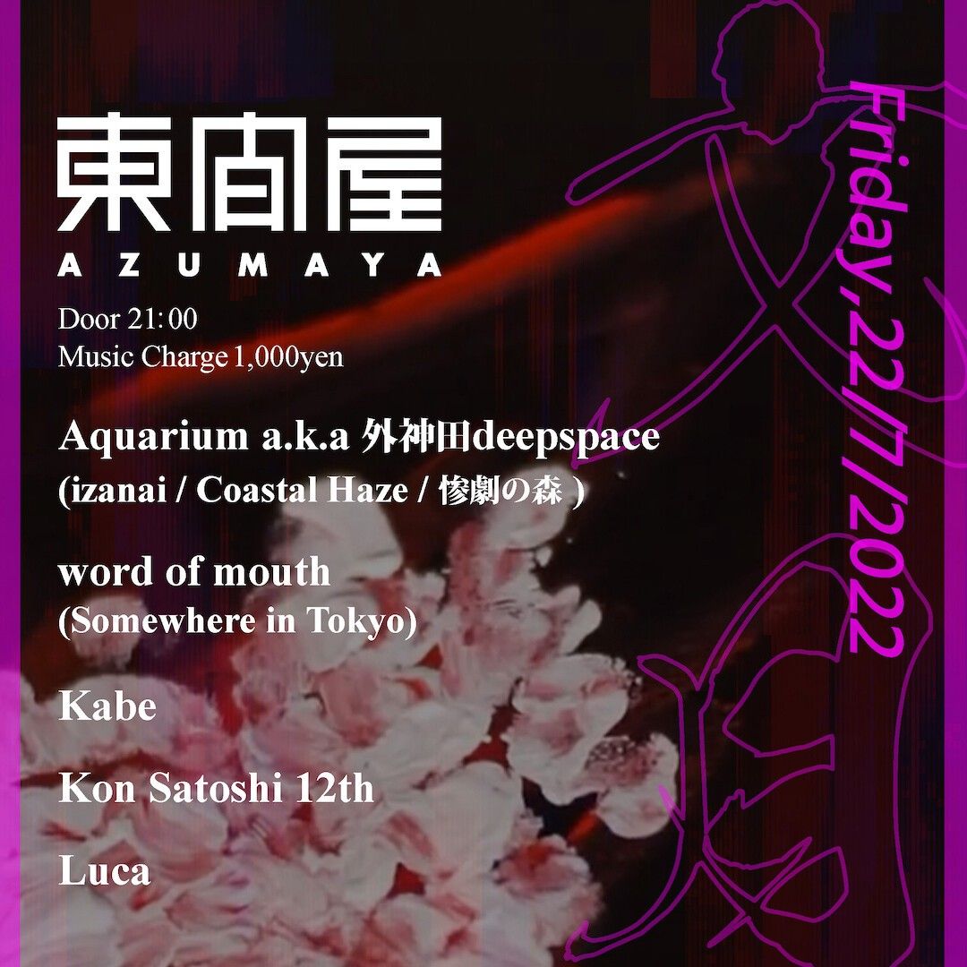 2022.07 22 JUL Azumaya -Friday- HOUSE TECHNO 0 Shares Facebook Twitter google Line DATE: 2022-07-22 FRI OPEN: 21:00 VENUE: PRICE: Music Charge ¥1,000 LINE UP: Aquarium a.k.a 外神田deepspace (izanai / Coastal Haze / 惨劇の森 ) word of mouth (Somewhere in Tokyo) Kabe Kon Satoshi 12th Luca