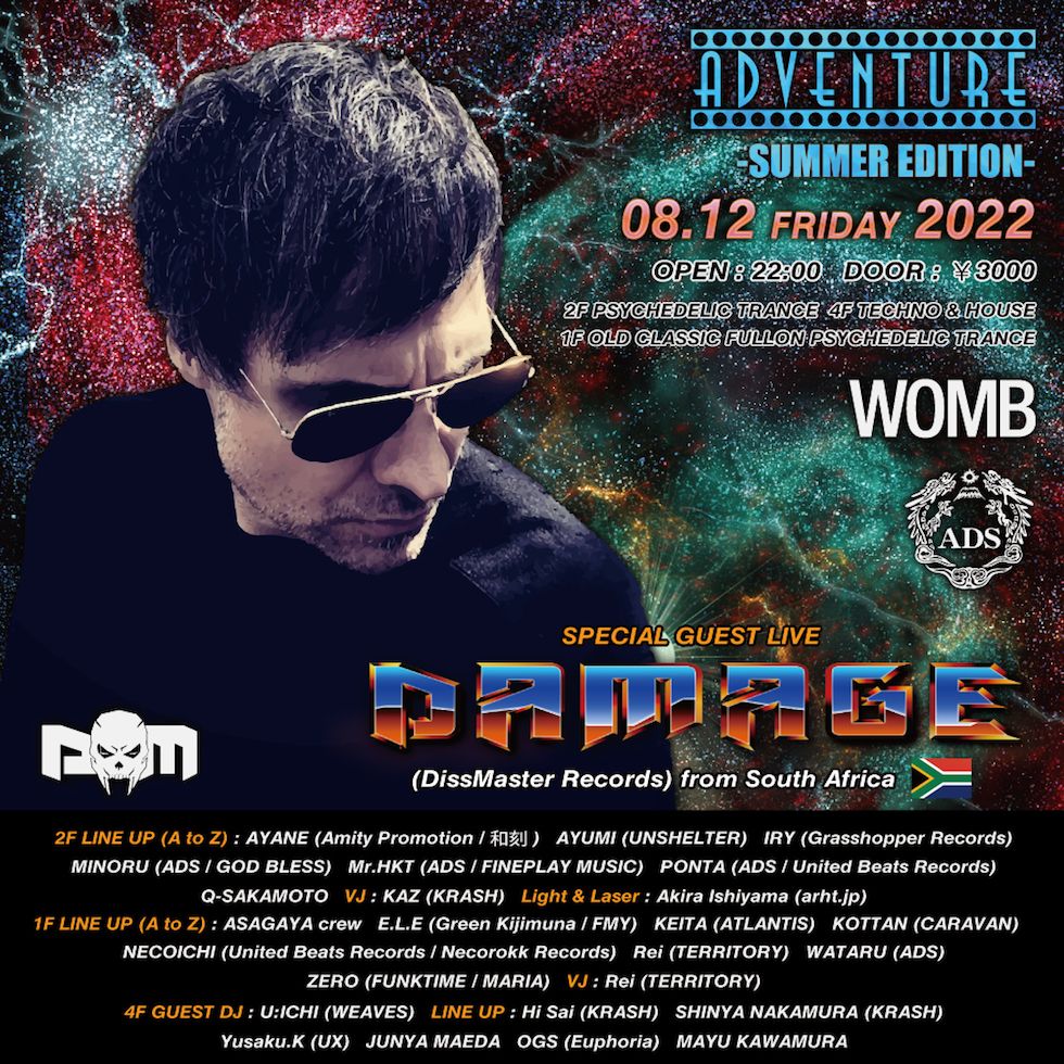 2F PSYCHEDELIC TRANCE FLOOR では SPECIAL GUEST LIVE に南アフリカ産の CRAZY な DARK FULLON PSYCHEDELIC TRANCE SOUND を魅了する DAMAGE が ADVENTURE 初登場!