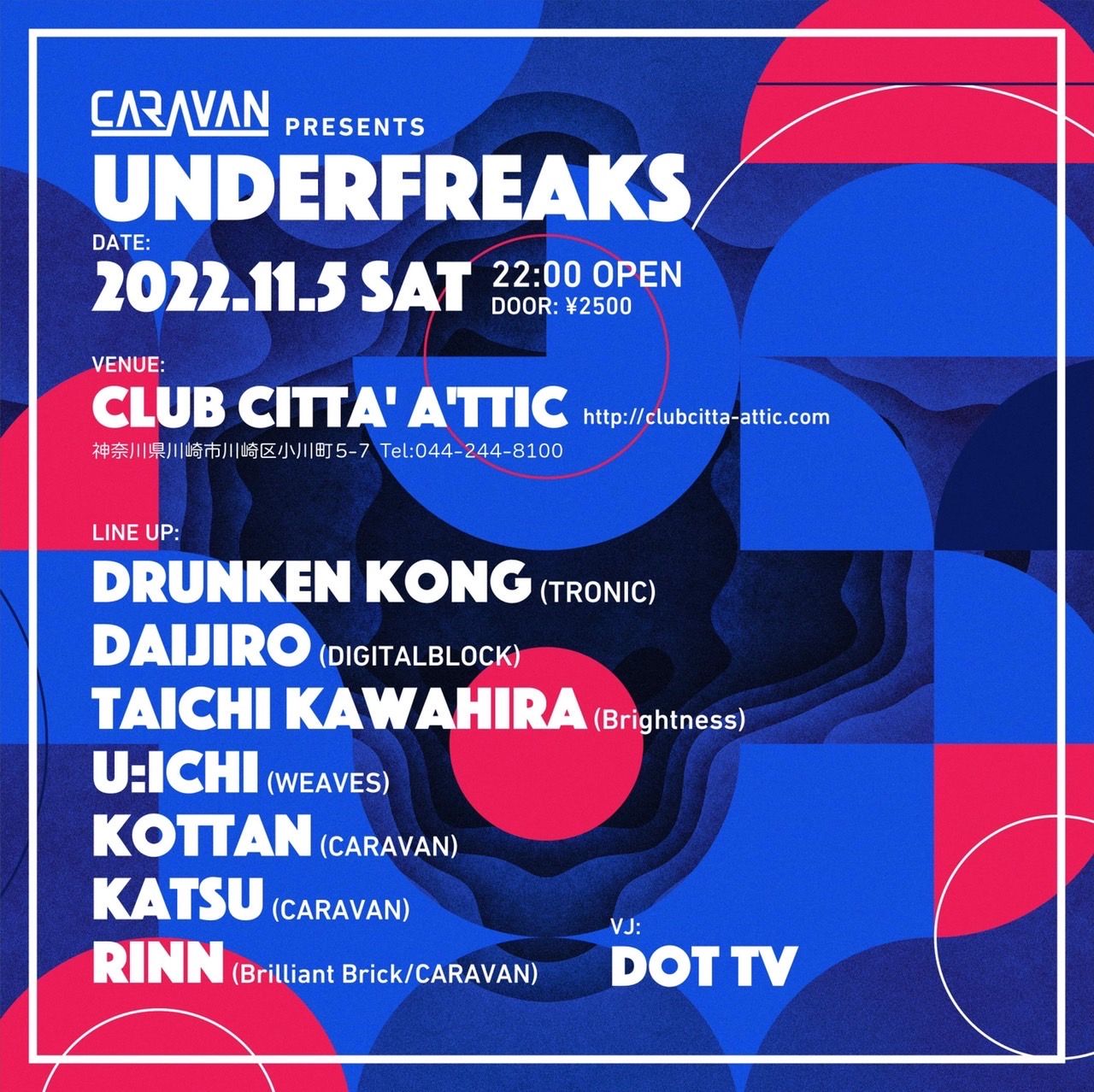 都内、川崎で不定期開催してきたテクノパーティー CARAVANが、川崎クラブチッタに併設し、吹き抜けの開放感あふれる CLUB CITTA' A'TTICにて「UNDER FREAKS」と銘打ち、約3年ぶりに開催!