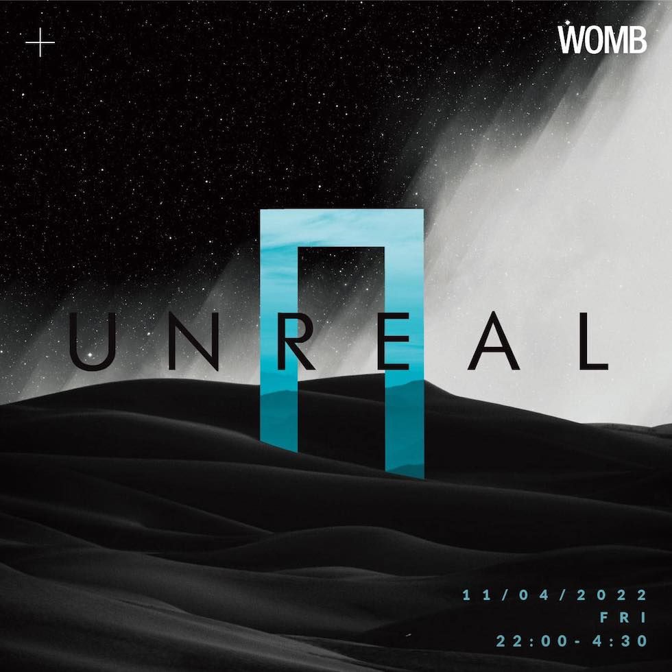 2021年6月、初の野外開催(おおばキャンプ村)で200人以上の動員、前回の WOMB 開催の2021年11月では、Kaoru Inoue、DJ YOGURT、をゲストに迎え300人以上の動員を記録した UNREAL が、今回スペシャルな一夜を彩るべく、Shhhhh、Yoshinori Hayashi をゲストに迎える。