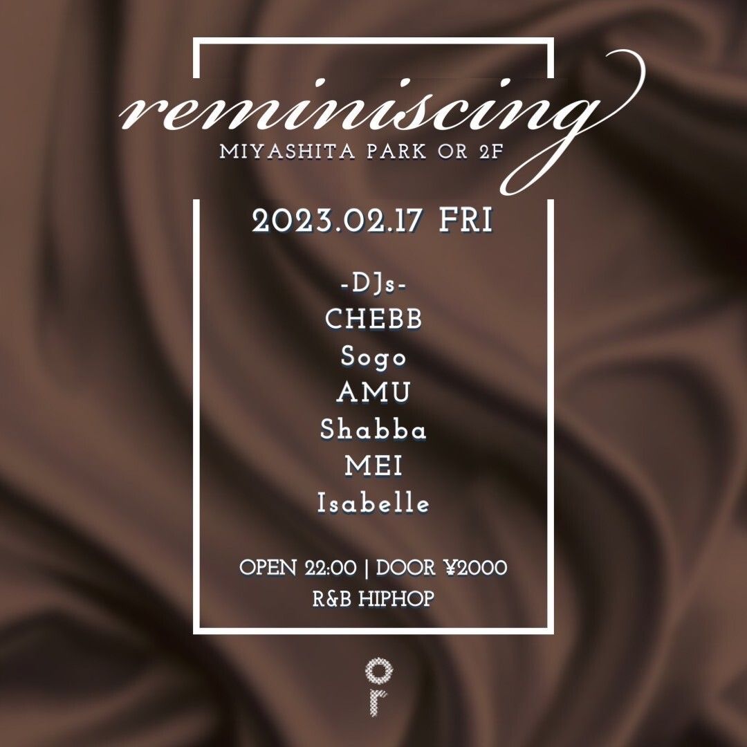 毎月第3金曜に「reminiscing」が登場。イベントタイトルは"懐かしむ"を意味し、幅広い年代を横断する珠玉のR&B, HIPHOPが一夜を構成する。世代、性別、人種問わず歌って踊れるボーダーレスなニューパーティー。