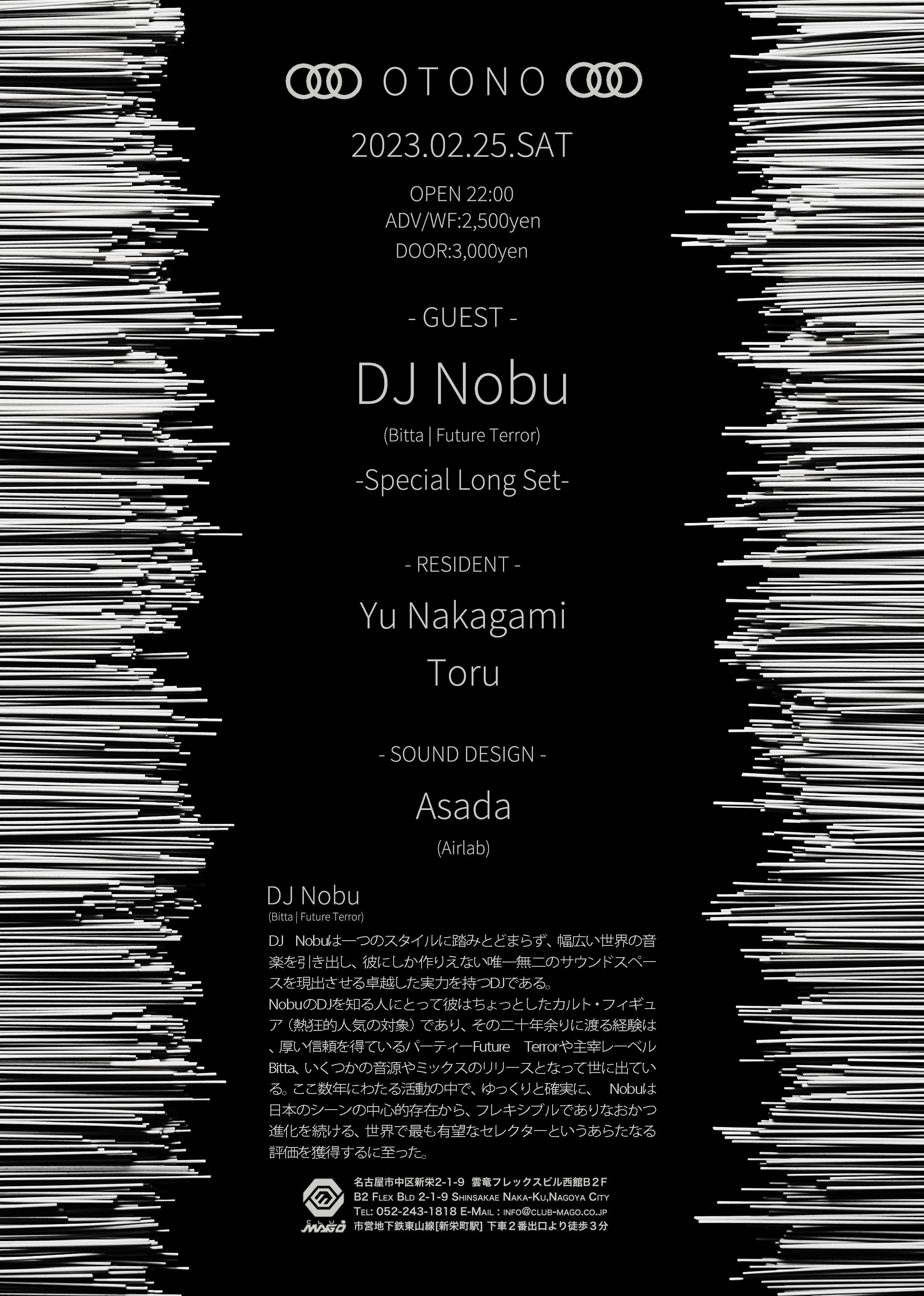 NobuのDJを知る人にとって彼はちょっとしたカルト・フィギュア(熱狂的人気の対象)であり、その二十年余りに渡る経験は、厚い信頼を得ているパーティーFuture Terrorや主宰レーベルBitta、いくつかの音源やミックスのリリースとなって世に出ている。ここ数年にわたる活動の中で、ゆっくりと確実に、 Nobuは日本のシーンの中心的存在から、フレキシブルでありなおかつ進化を続ける、世界で最も有望なセレクターというあらたなる評価を獲得するに至った。