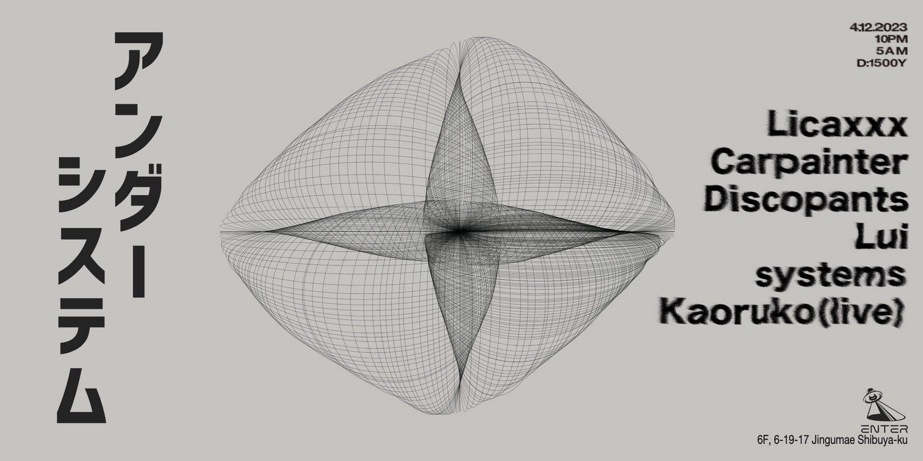 DJにはLicaxxxを筆頭にTREKKIE TRAXからCarpainter、Mo’Houseからdiscopantsが参加。DJ達によるエレクトロニックサウンドに加え、Kaorukoのliveからも目が離せない。SYSTEMSとLuiが目指す様々なしがらみから自分を解放し純粋に音を感じて楽しむ、そんな一夜にするのには十分すぎる顔揃い。個性溢れるアーティスト達による音とフロアを彩るみなさんの笑顔で素晴らしい夜を作りあげましょう。