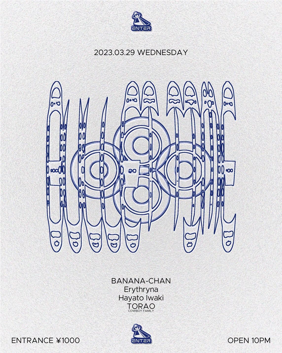沖縄出身のテクノDJのErythryna、Discoを核にスピリチュアルな選曲が特徴的なBANANA-CHAN、UKガラージドラムンベースを軸にトランスパーティを開催するHayato Iwaki、アンダーグラウンドを中心に活動するDJ crew COWBOY FAMILYのTORAOが出演。