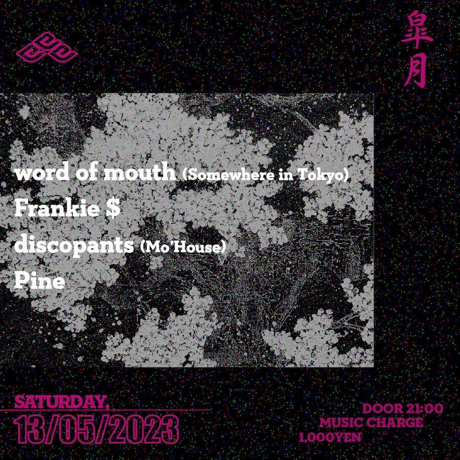 2023.05 13 MAY Azumaya -Friday- HOUSE 0 Shares Facebook Twitter google Line DATE: 2023-05-13 SAT OPEN: 21:00 VENUE: PRICE: Music Charge 1,000yen LINE UP: word of mouthword of mouth (Somewhere in Tokyo) Frankie $ discopants (Mo’House) Pine