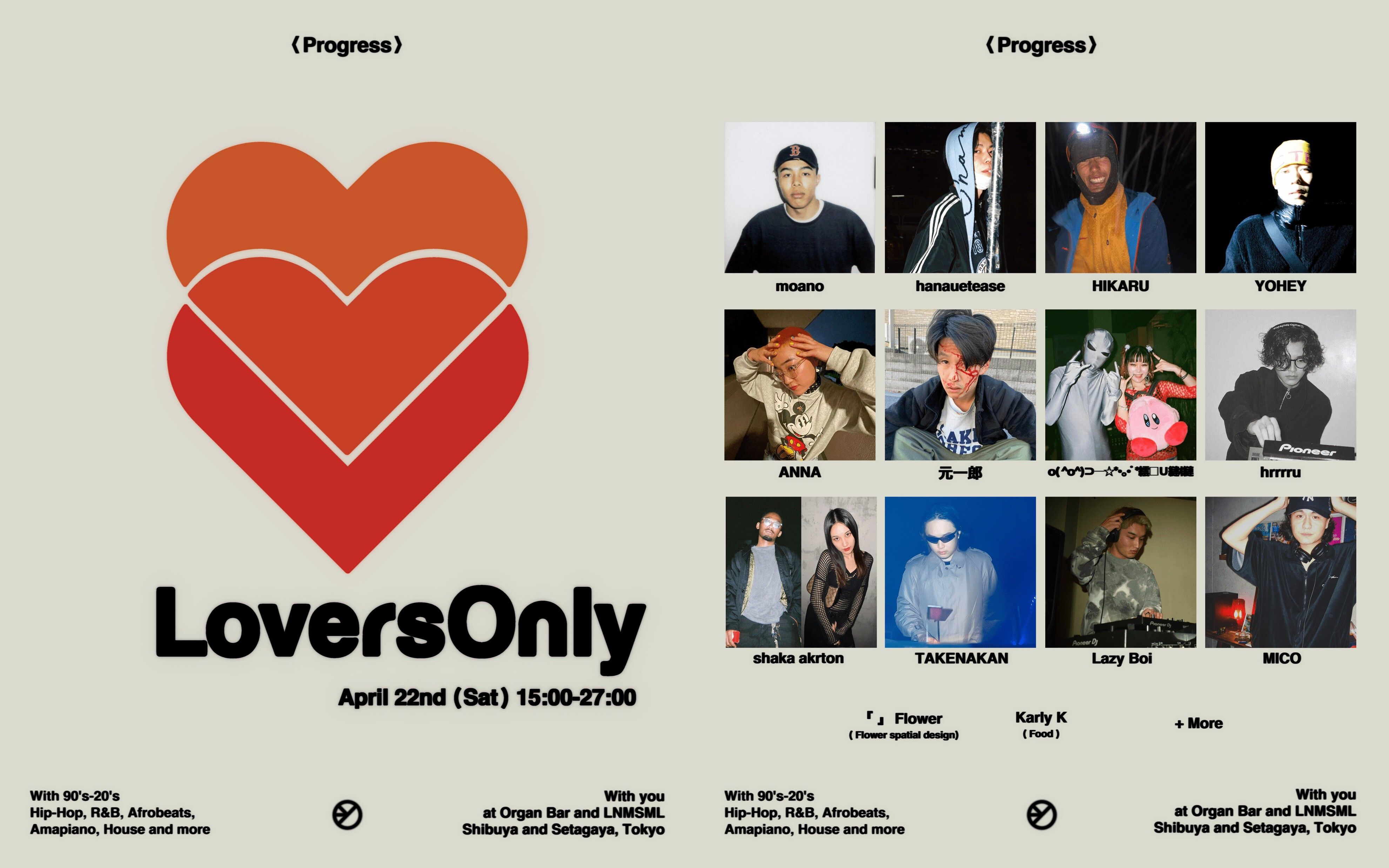 東京シーンで精力的に活動しながら、LoversOnlyと関わりの深いDJを招聘し、7時間を超えるロングイベントに。