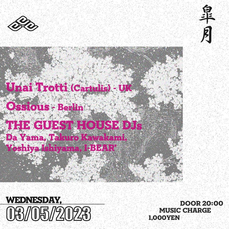 2023.05 03 MAY Azumaya -Wednesday- HOUSE 0 Shares Facebook Twitter google Line DATE: 2023-05-03 WED OPEN: 20:00 VENUE: PRICE: Music Charge 1,000yen LINE UP: Unai Trotti (Cartulis) -UK Ossious - Berlin THE GUEST HOUSE DJs Da Yama , Takuro Kawakami , Yoshiya Ishiyama , I-BEAR’