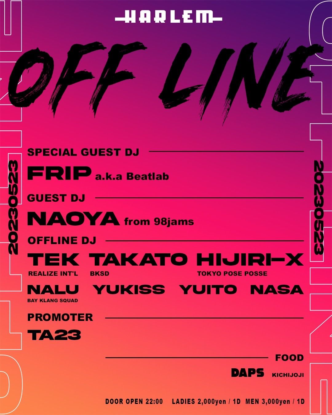 OFF LINE DJ: TEK (REALIZE INTERNATIONAL), TAKATO (BKSD), HIJIRI-X (TOKYO POSE POSSE), NALU (BAY KLANG SQUAD), YUKISS, YUITO, NASA