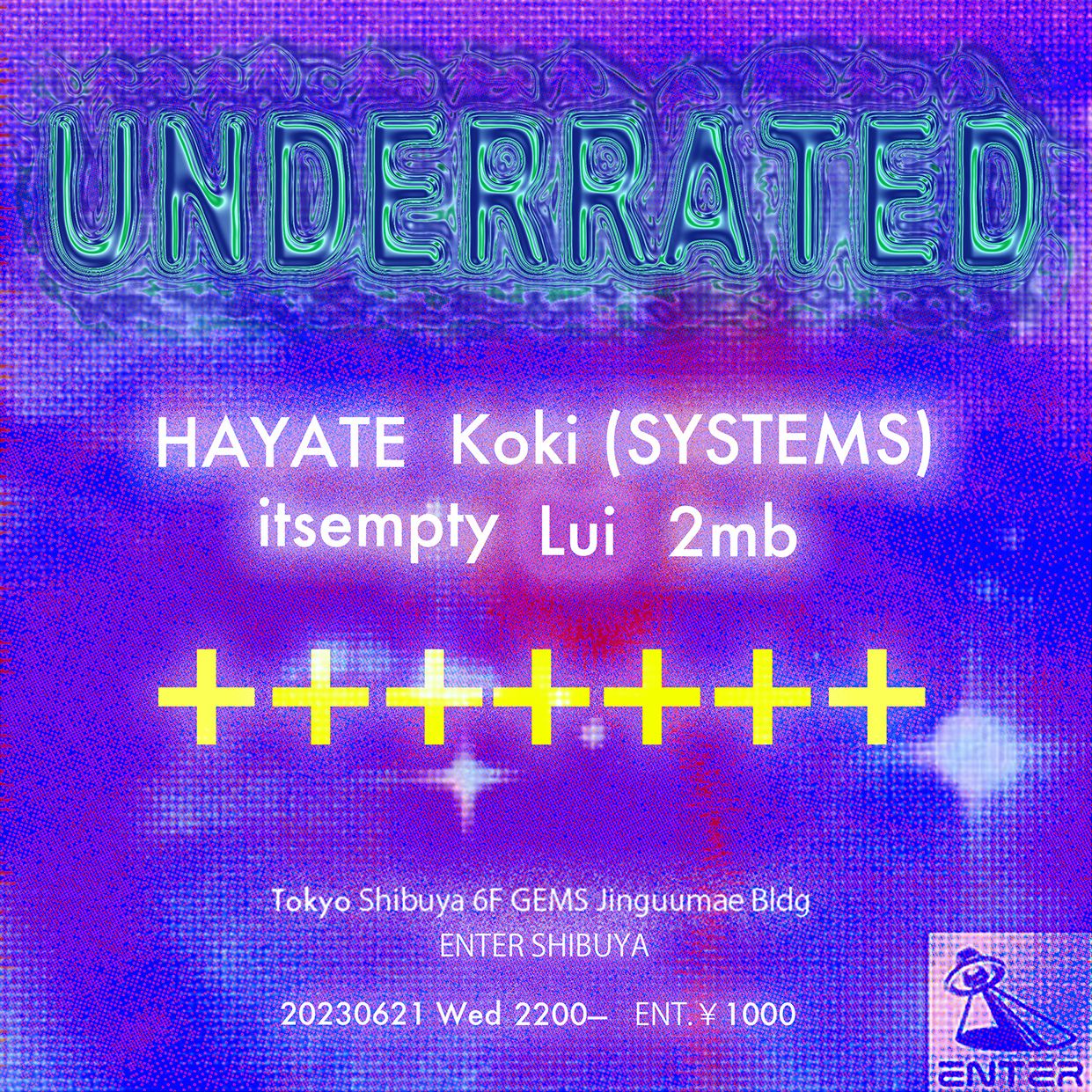 期待の若手LuiによるパーティーUNDERRATEDをENTERで開催。今回はMMOにも出演し、エネルギッシュなセットでフロアを魅了したHAYATEとKoki (SYSTEMS)、未だ謎多き新人ITSEMPTYと2mbが共演する。ユースのフレッシュで爆発的な刹那の瞬間は1秒たりとも見逃せない。