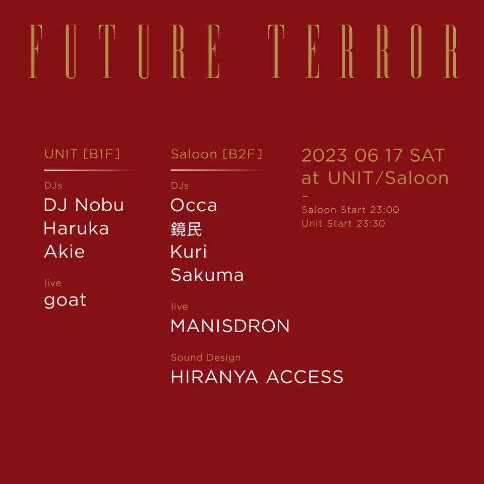 DJ Nobuを筆頭に国内最高峰のDJたちが集う「FUTURE TERROR」が、いよいよ来週6月17日(土)にテクノの聖地であった東京・代官山「UNIT/Saloon」で開催。