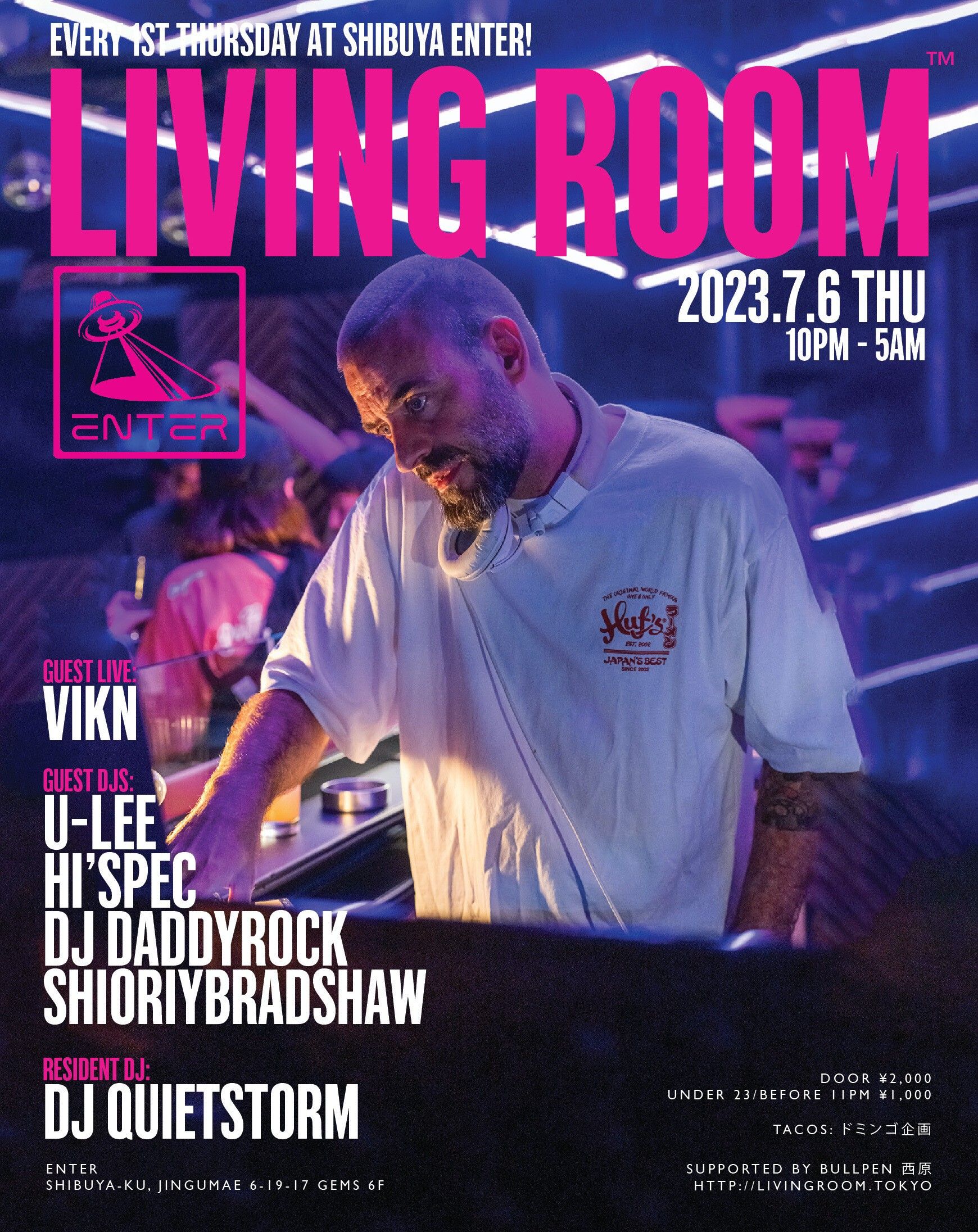今回、場所を渋谷ENTERに移し、キャパシティ的にソファーに座って DJするスタイルはできないが、渋谷ENTERのブース位置(フロアー中央)でのプレイはLIVING ROOM™のコンセプトにマッチする内容となるであろう。