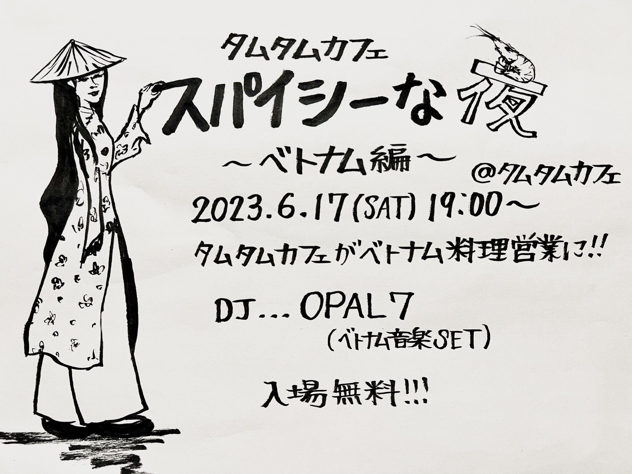 7年振りに『タムタムカフェのスパイシーな夜』開催!前回のタイ編に続き今回はベトナム編です。タムタムカフェが一夜限りのベトナム料理屋に!BGMは流石のOPAL君のベトナム音楽縛り〰︎!音楽でリアルtrip☆