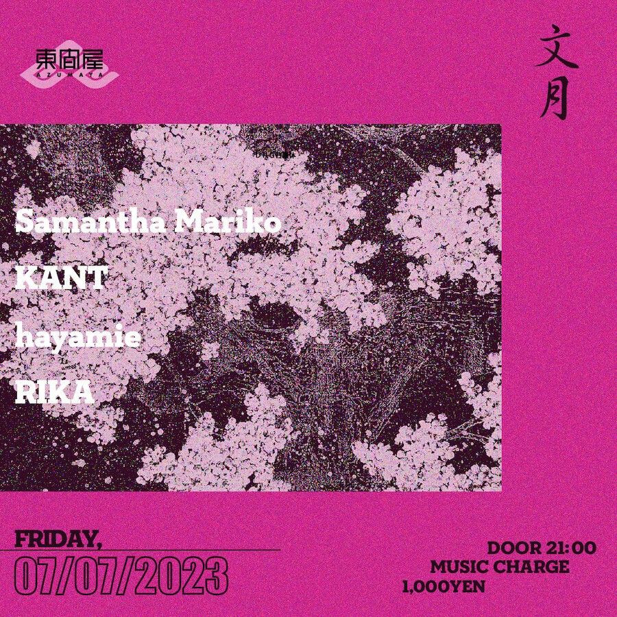 2023.07 07 JUL Azumaya -Friday- HIPHOP R&B 0 Shares Facebook Twitter google Line DATE: 2023-07-07 FRI OPEN: 21:00 VENUE: PRICE: Music Charge 1,000yen LINE UP: Samantha Mariko KANT hayamie RIKA