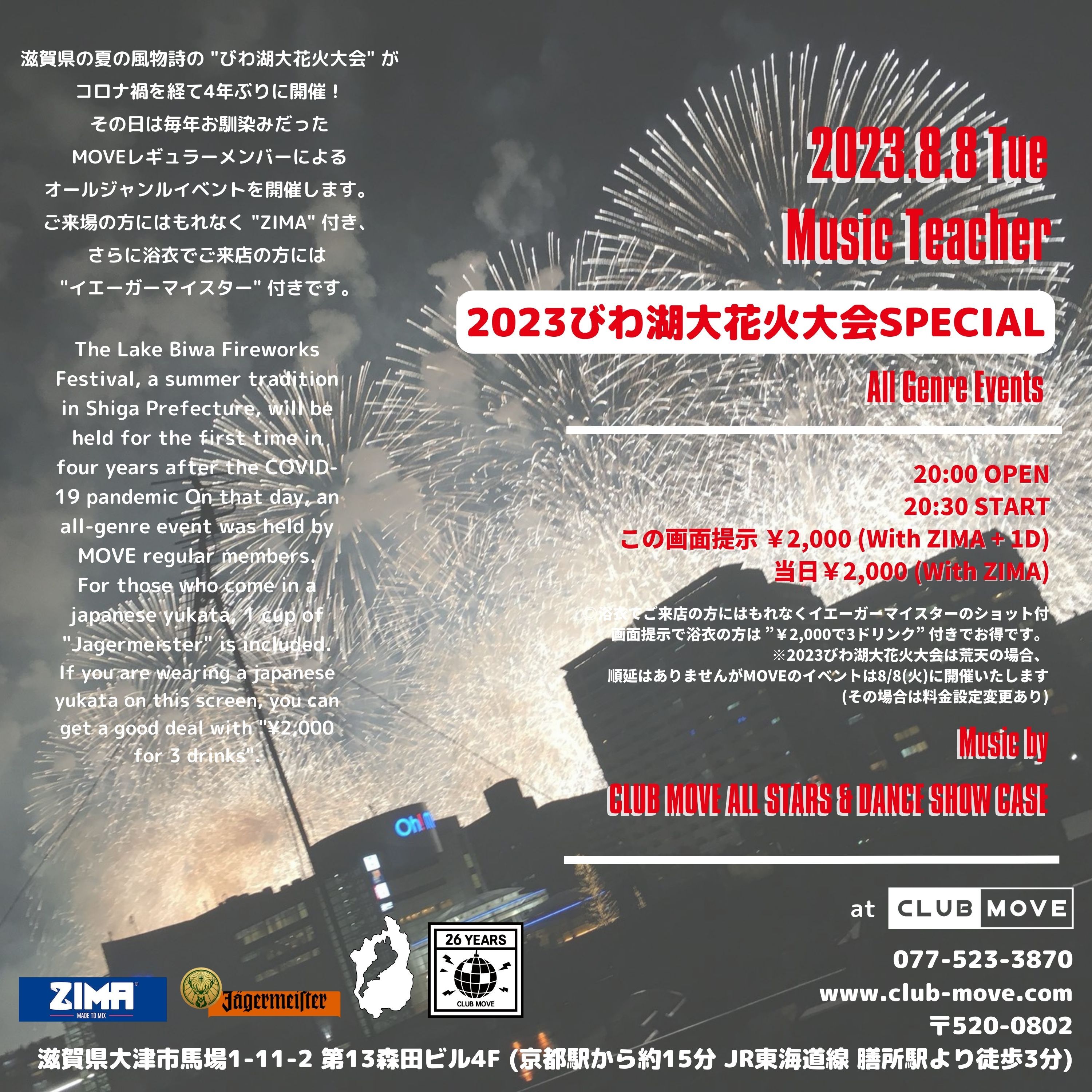 滋賀県の夏の風物詩の "びわ湖大花火大会" がコロナ禍を経て4年ぶりに開催!その日は毎年お馴染みだったMOVEレギュラーメンバーによるオールジャンルイベントを開催します。ご来場の方にはもれなく "ZIMA" 付き、さらに浴衣でご来店の方には "イエーガーマイスター" 1杯付きです!!