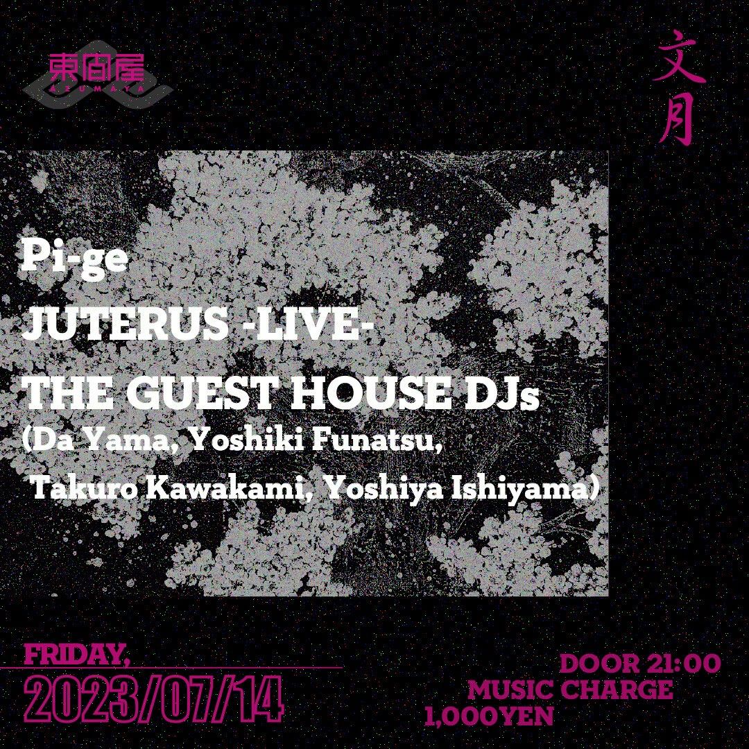 2023.07 14 JUL Azumaya -Friday- HOUSE TECHNO 0 Shares Facebook Twitter google Line DATE: 2023-07-14 FRI OPEN: 21:00 VENUE: PRICE: Music Charge 1,000yen LINE UP: Pi-ge JUTERUS -LIVE- THE GUEST HOUSE DJs (Da Yama, Yoshiki Funatsu, Takuro Kawakami, Yoshiya Ishiyama)