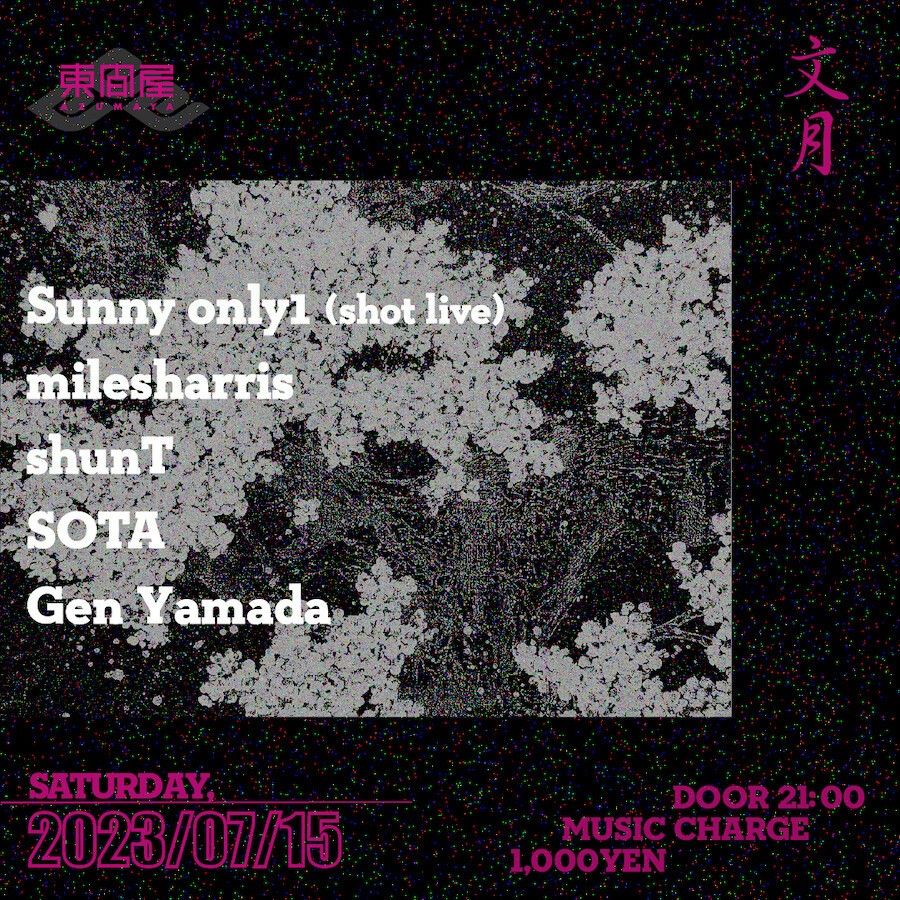 2023.07 15 JUL Azumaya -Saturday- ELECTRO 0 Shares Facebook Twitter google Line DATE: 2023-07-15 SAT OPEN: 21:00 VENUE: PRICE: Music Charge 1,000yen LINE UP: Sunny only1 (shot live) milesharris shunT SOTA Gen Yamada