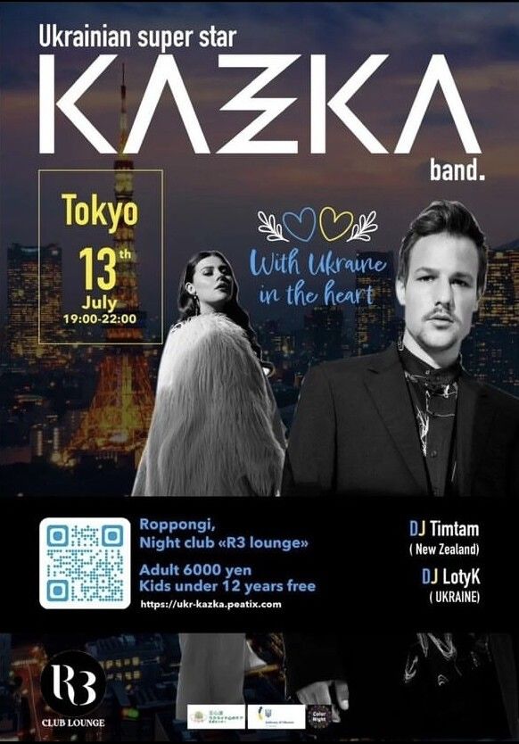 2023.07 13 JUL KAZKA with Ukraine in the heart POP ELECTRO 0 Shares Facebook Twitter google Line DATE: 2023-07-13 THU OPEN: 19:00 VENUE: PRICE: ¥6,000 + 1ドリンク付 LINE UP: LIVE:KAZKA DJ:DJ Timtam(NewZealand) DJ LotyK(Ukraine) R3 ClunLoungeにて、ウクライナのスーパースターバンド KAZKA がパフォーマンス!! KAZKAはエレクトロフォークの要素を取り入れた、ウクライナで幅広い年代層から高い人気を集めている、U-POPバンドです。 KAZKAバンド公式YOUTUBEチャンネル https://www.youtube.com/@kazkaband/videos KAZKAバンド公式インスタグラム:@kazka.band 唯一無二の彼らの音楽を、R3が誇るサウンドシステムでぜひ生で体感して下さい! LIVE:KAZKA DJ:DJ Timtam(NewZealand) DJ LotyK(Ukraine)