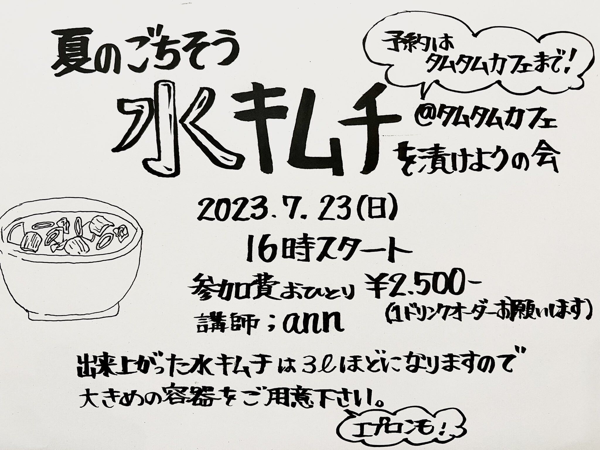 大好評キムチワークショップ第3弾!今回は暑い夏に最高の水キムチWSです。野菜たっぷりで、乳酸発酵した汁ごと頂く、あまり辛くない水キムチ。つけ汁で韓国冷麺のスープも作れます!基本の野菜と、お好みで選んで頂いた野菜であなた好みの水キムチを漬けられますよ♡バテ気味の身体にもオススメです。興味あるけどやった事が無い皆さん、ぜひ!ご予約は☞ @tamutamucafe まで◎