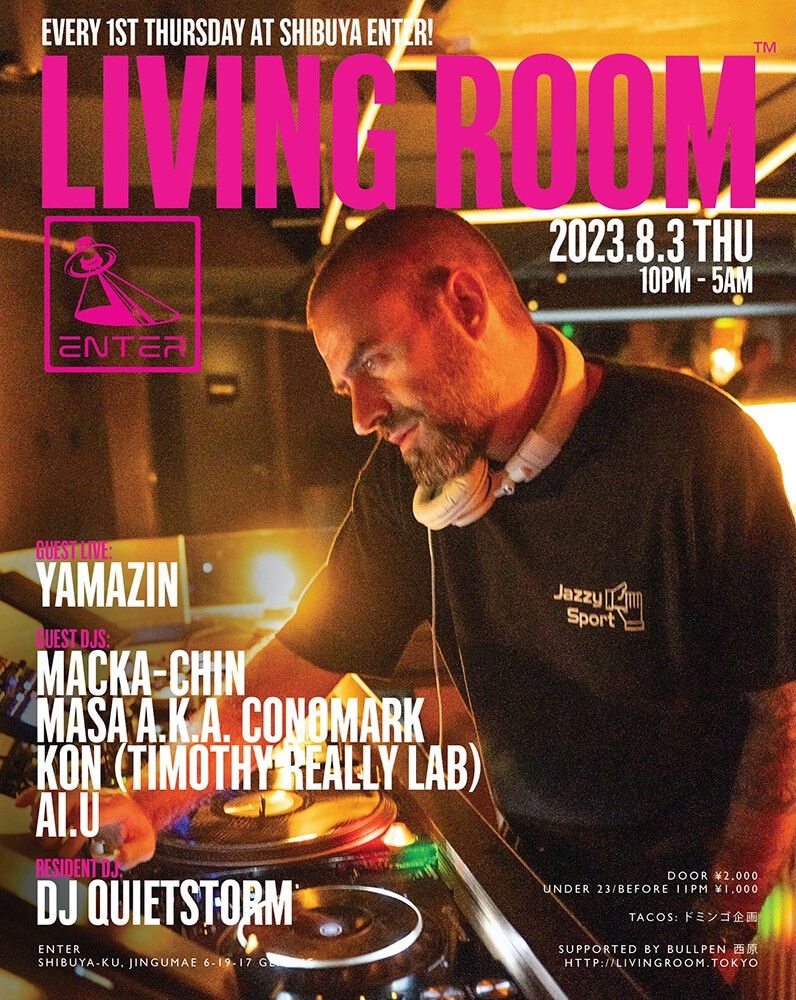 ヒップホップ/ハウス/ジャズに限らず、様々な手法で独自の音楽を提示し続けた真の音楽家であるDJ Quietstorm。彼だからこそ為し得ることのできる特別な一夜にはこれまで、平日のパーティにも関わらず様々なジャンルのトップDJ/アーティストだけでなく、これからの音楽を担う若いアーティストを招き、音楽を愛する多くの人々を魅了してきた。 今回、場所を渋谷ENTERに移し、キャパシティ的にソファーに座って DJするスタイルはできないが、渋谷ENTERのブース位置(フロアー中央)でのプレイはLIVING ROOM™のコンセプトにマッチする内容となるであろう。 毎月第1木曜日に開催されるLIVING ROOM™のNew Standard Startedを体感しよう。