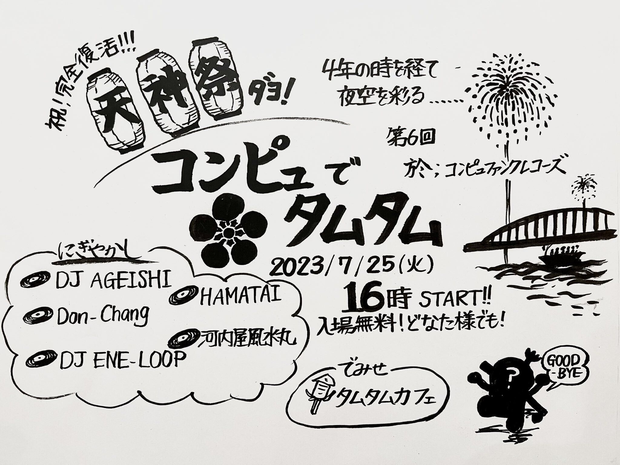 4年の時を経て夜空を彩る…。完全復活!天神祭!年に1度のレミーマルタンオーガナイズ☆7月25日火曜に北浜Compufunk Recordsにて第6回目の『天神祭ダヨ!コンピュdeタムタム』でいつもと違うでみせなお祭りメニューで出張タムタムカフェ♫今年も豪華DJ陣出演で入場無料です!祭りの休憩所にも是非◎