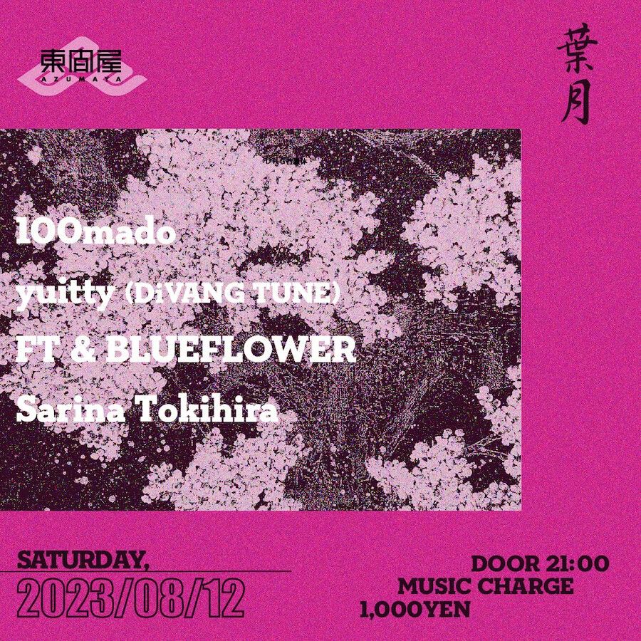 2023.08 12 AUG Azumaya -Saturday- BASS MUSIC 0 Shares Facebook Twitter google Line DATE: 2023-08-12 SAT OPEN: 21:00 VENUE: PRICE: Music Charge 1,000yen LINE UP: 100mado yuitty (DiVANG TUNE) FT & BLUEFLOWER Sarina Tokihira