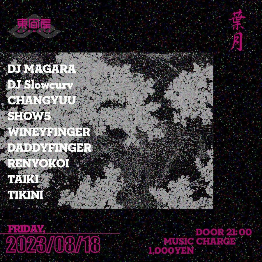 2023.08 18 AUG Azumaya -Friday- HIPHOP 0 Shares Facebook Twitter google Line DATE: 2023-08-18 FRI OPEN: 21:00 VENUE: PRICE: Music Charge 1,000yen LINE UP: DJ MAGARA DJ Slowcurv CHANGYUU SHOW5 WINEYFINGER DADDYFINGER RENYOKOI TAIKI TIKINI