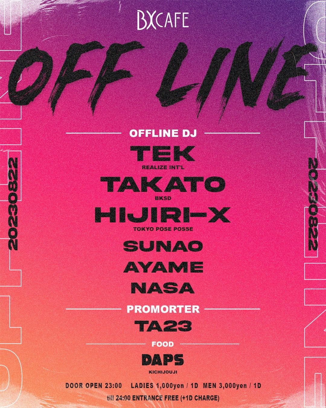 OFF LINE DJ: TEK (REALIZE INTERNATIONAL), TAKATO (BKSD), HIJIRI-X (TOKYO POSE POSSE), NALU (BAY KLANG SQUAD), NASA, SUNAO, AYAME