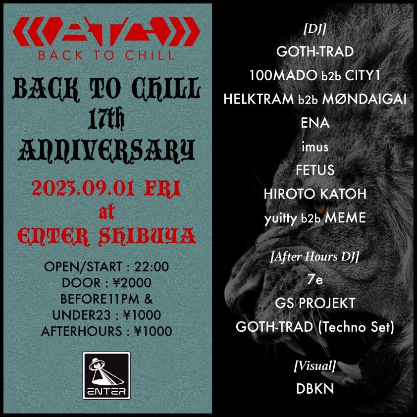 主宰GOTH-TRADがUKのダブステップ・シーンと繋がるきっかけとなった自身のタイトル「Back To Chill」を由来に、2006年に始動した同名のパーティは日本初のレギュラー・ダブステップ・パーティとして話題を呼び、国内のヘッズのみならず、海外のベース・ミュージック・ファンからも注目を集めている。今やダブステップ/ベースミュージック・パーティの最高峰かつ代名詞にもなっている。