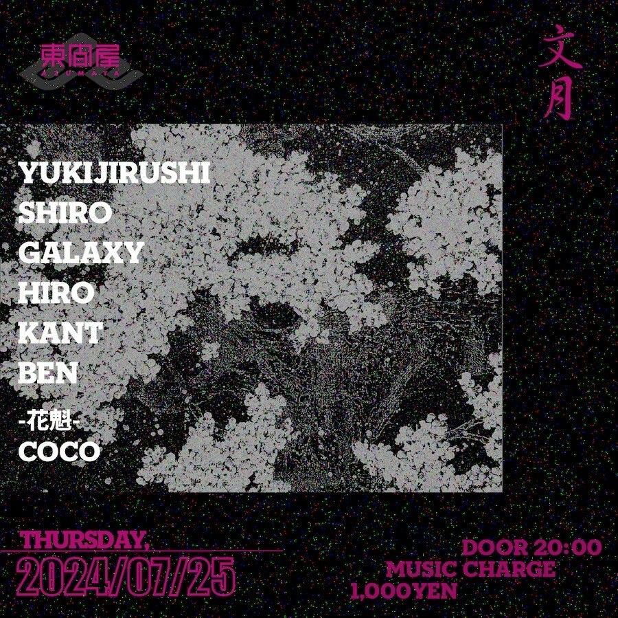 2024.07 25 JUL Azumaya -Thursday- HIPHOP 0 Shares Facebook Twitter google Line DATE: 2024-07-25 THU OPEN: 20:00 VENUE: PRICE: Music Charge 1,000yen LINE UP: YUKIJIRUSHI SHIRO GALAXY HIRO KANT BEN -花魁- Coco