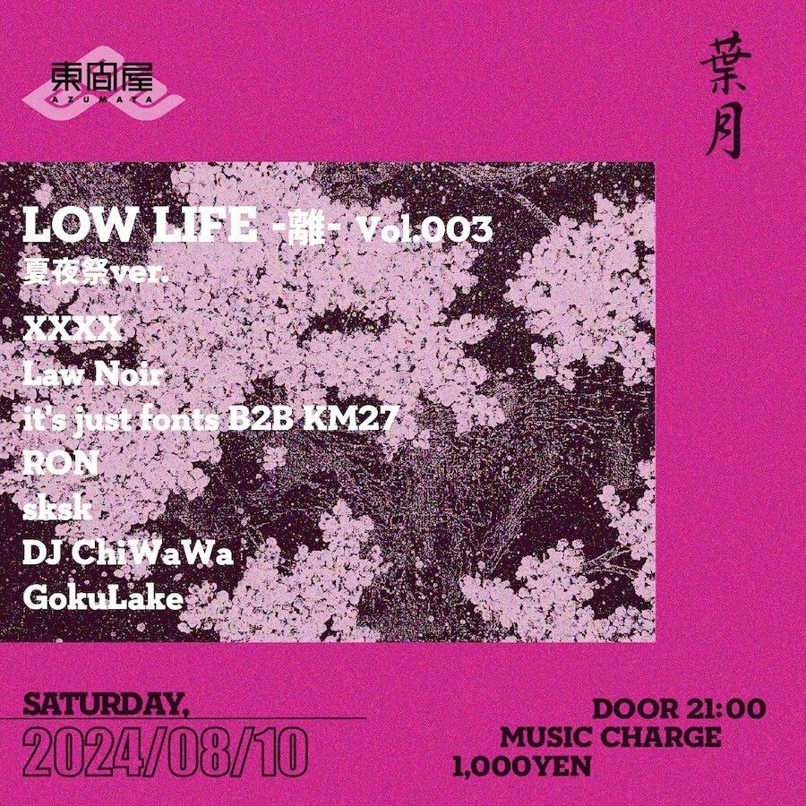 2024.08 10 AUG LOW LIFE -離- Vol.003 夏夜祭ver. BASS MUSIC TECHNO 0 Shares Facebook Twitter google Line DATE: 2024-08-10 SAT OPEN: 21:00 VENUE: PRICE: Music Charge 1,000yen LINE UP: XXXX Law Noir it's just fonts B2B KM27 RON sksk DJ ChiWaWa GokuLake