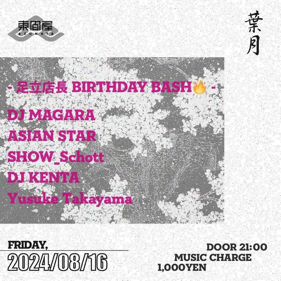 2024.08 16 AUG Azumaya -Friday- 足立店長 BIRTHDAY BASH ALLMIX 0 Shares Facebook Twitter google Line DATE: 2024-08-16 FRI OPEN: 21:00 VENUE: PRICE: Music Charge 1,000yen LINE UP: DJ MAGARA ASIAN STAR SHOW_Schott DJ KENTA Yusuke Takayama