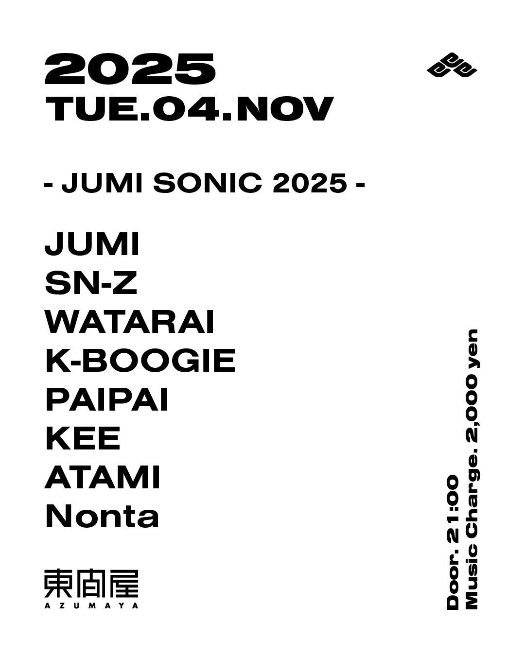 2025.11 04 NOV JUMI SONIC 2025 HIPHOP 0 Shares Facebook Twitter google Line DATE: 2025-11-04 TUE OPEN: 21:00 VENUE: PRICE: Music Charge 2,000yen LINE UP: JUMI SN-Z WATARAI K-BOOGIE PAIPAI KEE ATAMI Nonta