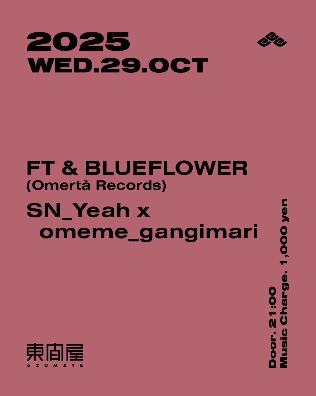 2025.10 29 OCT Azumaya -Wednesday- BASS MUSIC 0 Shares Facebook Twitter google Line DATE: 2025-10-29 WED OPEN: 21:00 VENUE: PRICE: Music Charge 1,000yen LINE UP: FT & BLUEFLOWER (Omertà Records) SN_Yeah × omeme_gangimari