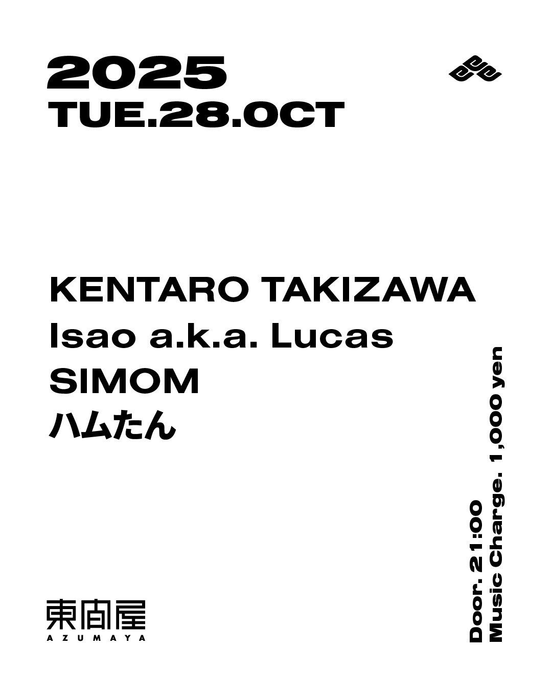 2025.10 28 OCT Azumaya -Tuesday- ALLMIX 0 Shares Facebook Twitter google Line DATE: 2025-10-28 TUE OPEN: 21:00 VENUE: PRICE: Music Charge 1,000yen LINE UP: KENTARO TAKIZAWA Isao a.k.a. Lucas SIMOM ハムたん