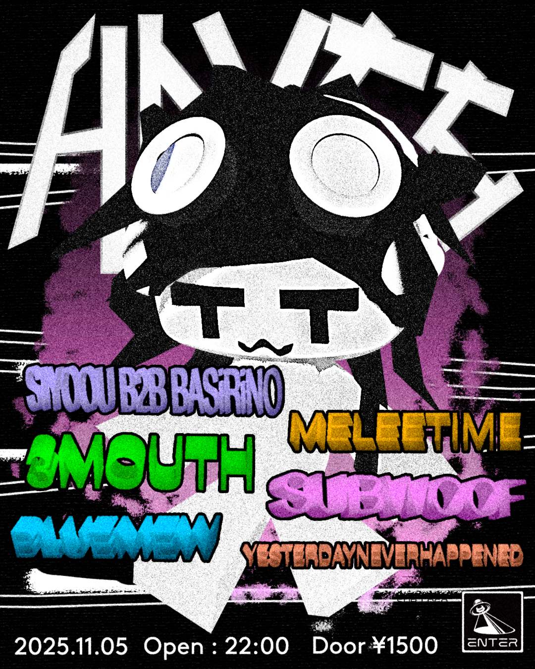 ローカルからは、ヒソカ(HUNTER×HUNTER)の如く音を多様に遊ばせる異才MELEETIME、繊細な感性だからこそのハードコアでオーディエンスの精神をプリズンブレイクさせるBASiRiNO、そのキュートさとは裏腹に痛覚の限界まで訴えかけるブレイクコアを繰り出す中国出身Siyoou_u』♡を迎え、渋谷の夜、時空を飛ばす。