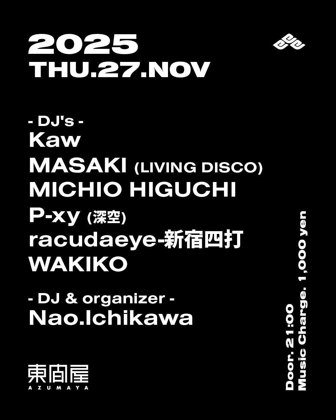 2025.11 27 NOV Azumaya -Thursday- HOUSE TECHNO 0 Shares Facebook Twitter google Line DATE: 2025-11-27 THU OPEN: 21:00 VENUE: PRICE: Music Charge 1,000yen LINE UP: - DJ's - Kaw MASAKI (LIVING DISCO) MICHIO HIGUCHI P-xy (深空) racudaeye-新宿四打 WAKIKO - DJ & organizer - Nao.Ichikawa