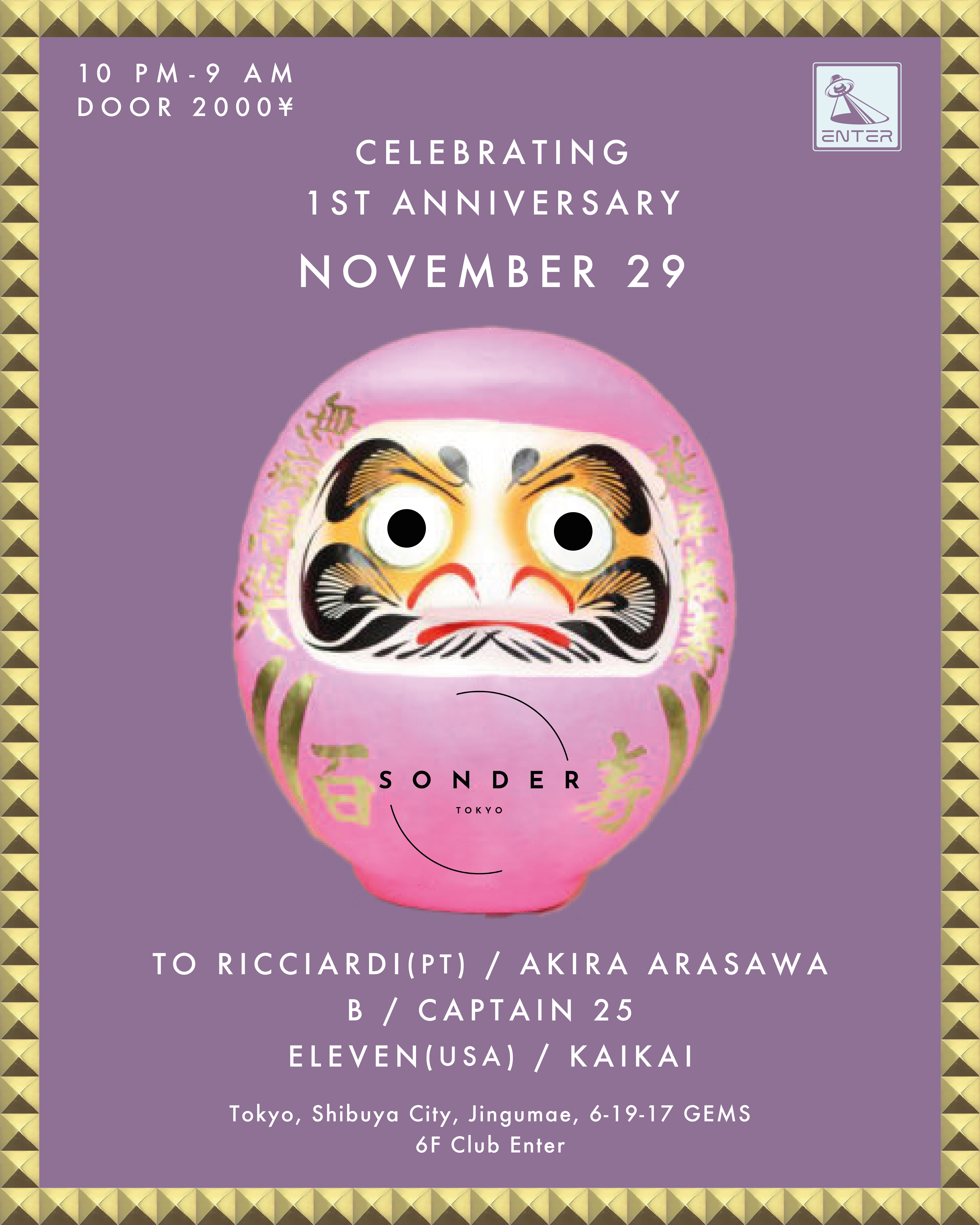 2025.11 29 NOV SONDER TOKYO 1ST ANNIVERSARY HOUSE TECH HOUSE 0 Shares Facebook Twitter google Line DATE: 2025-11-29 SAT OPEN: 22:00 VENUE: PRICE: ¥2000 Door LINE UP: TO RICCIARDI (PT) AKIRA ARASAWA B CAPTAIN 25 ELEVEN (USA) KAIKAI 『SONDER TOKYO 1ST ANNIVERSARY』 SONDER TOKYO 1ST ANNIVERSARYを開催。あっという間に1周年を迎えた11/29、豪華なラインナップとサプライズをご用意。フロアで踊ってくださる皆さんと、音楽を奏でてくれるDJに感謝を。ご来場お待ちしております。 Open 22:00 ¥2000 Door ※本公演では20歳未満の方のご入場は一切お断りさせて頂きます。 年齢確認の為、ご入場の際に全ての方にIDチェックを実施しております。 写真付き身分証明証をお持ち下さい。