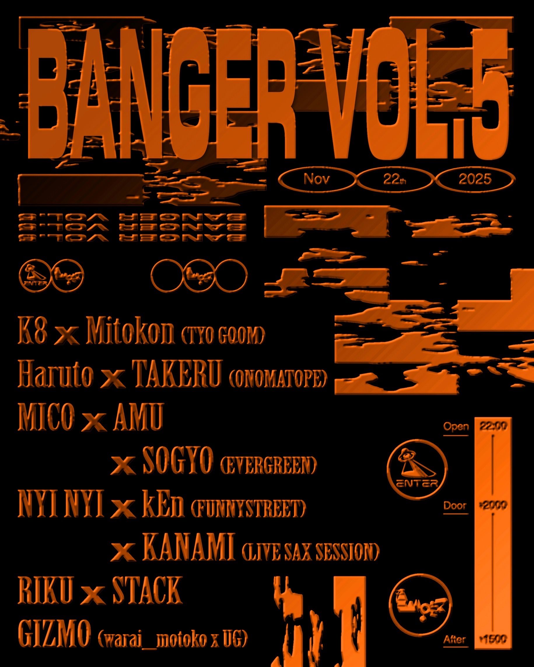 2025.11 22 NOV BANGER VOL.5 TECH HOUSE 0 Shares Facebook Twitter google Line DATE: 2025-11-22 SAT OPEN: 22:00 VENUE: PRICE: ¥2000 Door | ¥1500 Morning LINE UP: K8 x mitokon (TYO GQOM) Haruto x TAKERU (ONOMATOPE) MICO x AMU NYI NYI x SOGYO (EVERGREEN) NYI NYI x kEn (FUNNYSTREET) NYI NYI x KANAMI (LIVE SAX SESSION) r1ku x STACK GIZMO (warai_motoko x UG) 東京を拠点に活動する若手DJで構成されたDJクルーTERRACOTTAのメンバーである22が主催する、ダンスホール、アフロビーツパーティBanger VOL.5を開催。 Open 22:00 ¥2000 Door ¥1500 Morning ※You must be over 20 with photo ID. 本公演では20歳未満の方のご入場は一切お断りさせて頂きます。 年齢確認の為、ご入場の際に全ての方にIDチェックを実施しております。 写真付き身分証明証をお持ち下さい BANGER · BANGER MIX Vol.2 by DJ NYI NYI