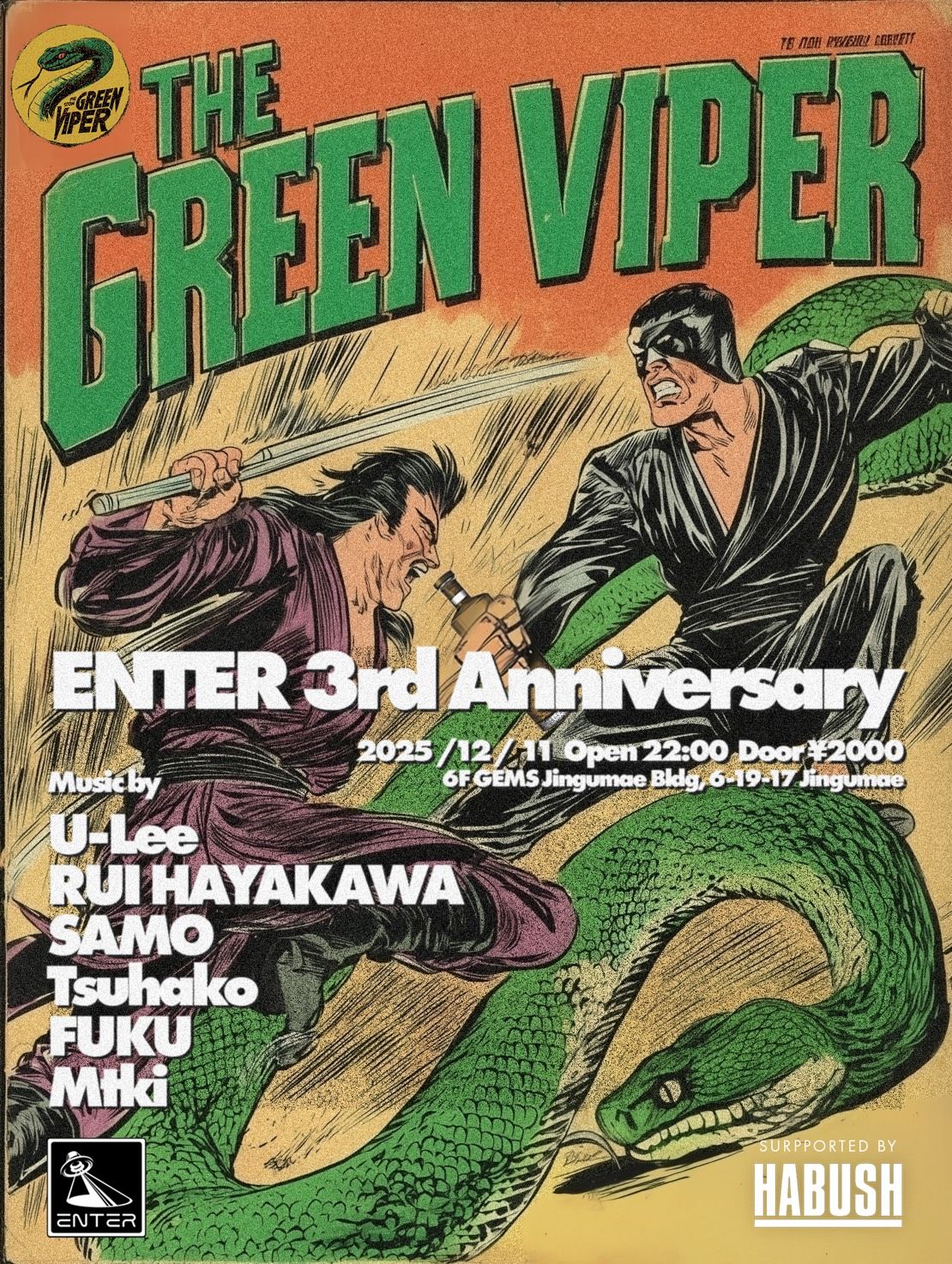 2022年12月15日にオープンしたENTER SHIBUYA。この度、3周年を祝した2週間に及ぶ9日間のアニバーサリーパーティを開催する。記念すべきDAY7は “The Green Viper” をテーマに、ヒップホッププロデューサー/ビートメイカー/DJらが一堂に会す。